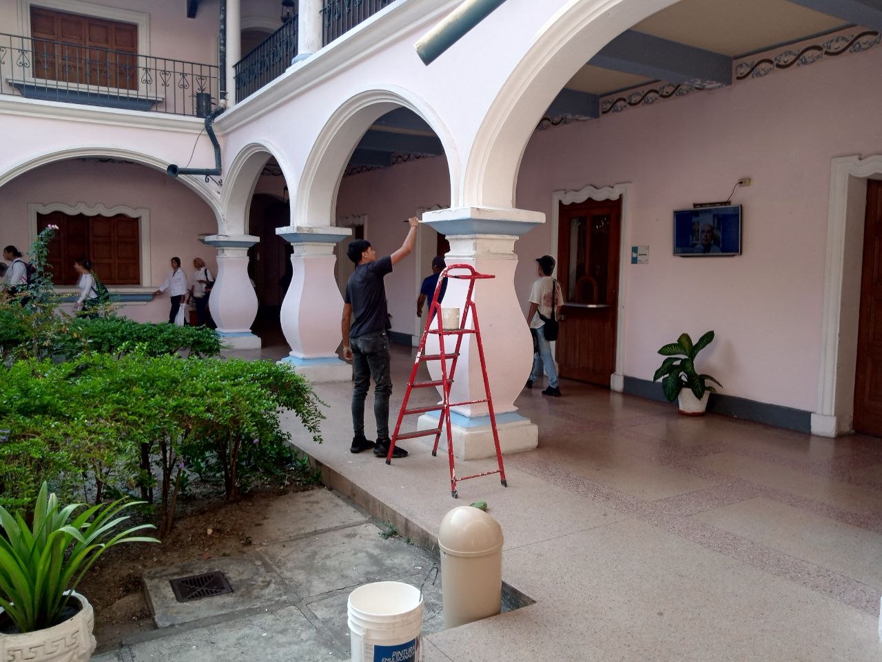 A tal efecto, continuaron las labores de pintura dentro de las instalaciones, incluido el comedor, actividad llevada a cabo por el personal de Servicios Generales, donde se conservan los colores tradicionales de la institución y los motivos arabescos del diseño original, los cuales cumplen con las ordenanzas del Instituto de Patrimonio Cultural. Es de precisar que, a inicios de marzo, se hizo la sustitución del techo en la parte alta del ala sur, acción que ameritó el cambio de vigas, remoción de escombros y reinstalación de tejas.